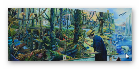Inden Lauget gik videre til aftenens hovedformål, blev de brødrene ledt ned i den ”hemmelige (ulve-) hule, der har tjent som Corona Kontor og ellers øvelokale og kreative rum, og introduceret til ”Erik Lindberg - Maleren af Verden” – Regnskovsbillede.